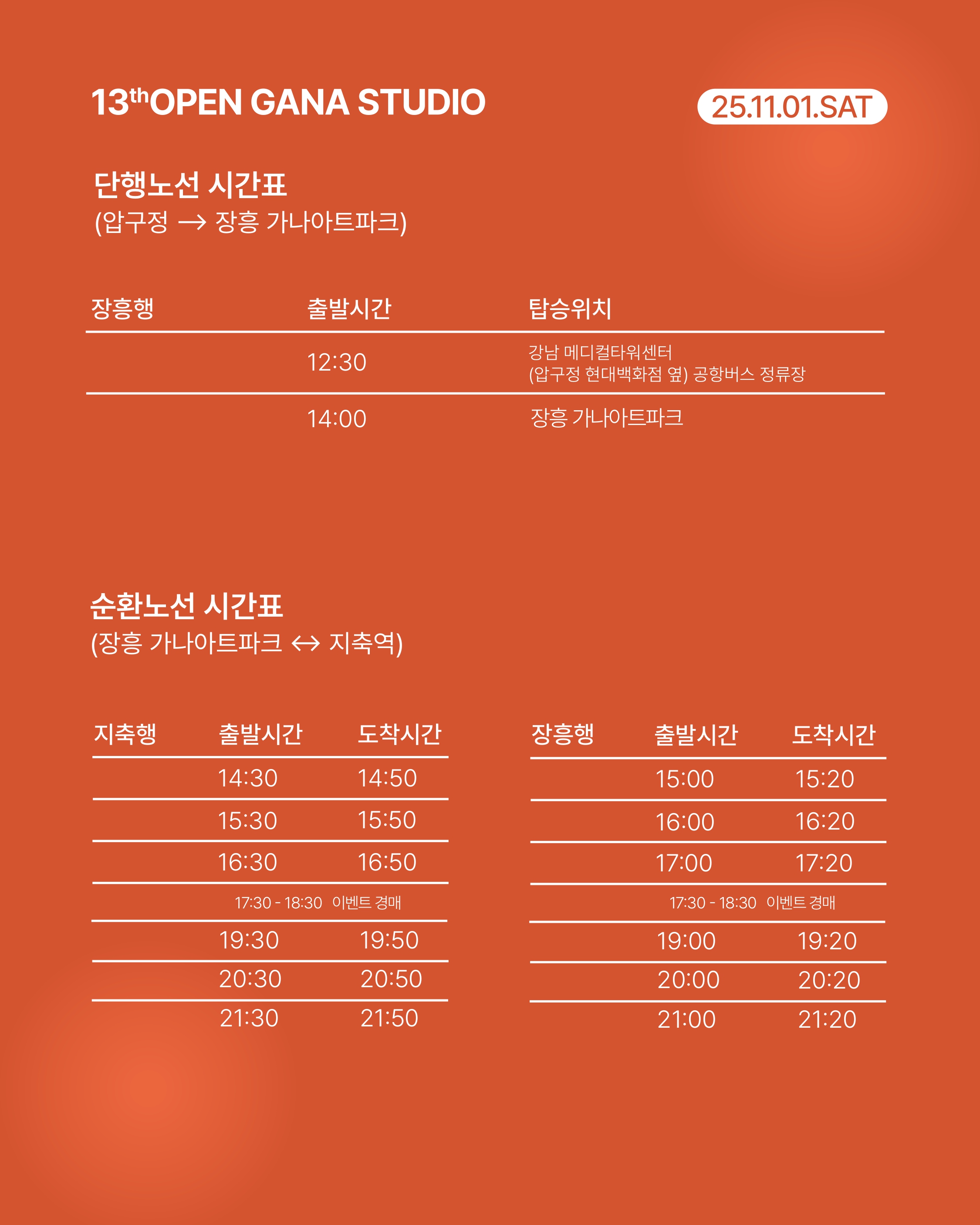 1년에 단 한번, 50여명의 예술가들의 작업실에 여러분을 초대합니다. 가나 아트파크에서 진행되는 본 프로그램에서는 가나 아뜰리에 입주작가의 작업실 탐방부터 <우리술상회>팝업하우스, 도슨트 프로그램, DJ파티 그리고 서울옥션의 NEW 장흥 아트 스토리지에서 전시와 이벤트 경매도 준비되어 있어, 하루를 가득 채운 특별한 경험을 선사합니다.